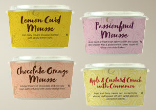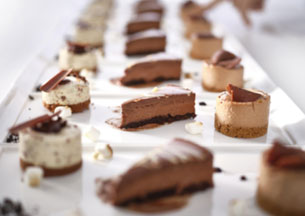 White Chocolate & Raspberry, Zesty Lemon drizzled with a lemon curd, Chocolate orange mousse, Passionfruit bavarois, Apple & Custard with cinnamon, Caramel & chocolate mousse